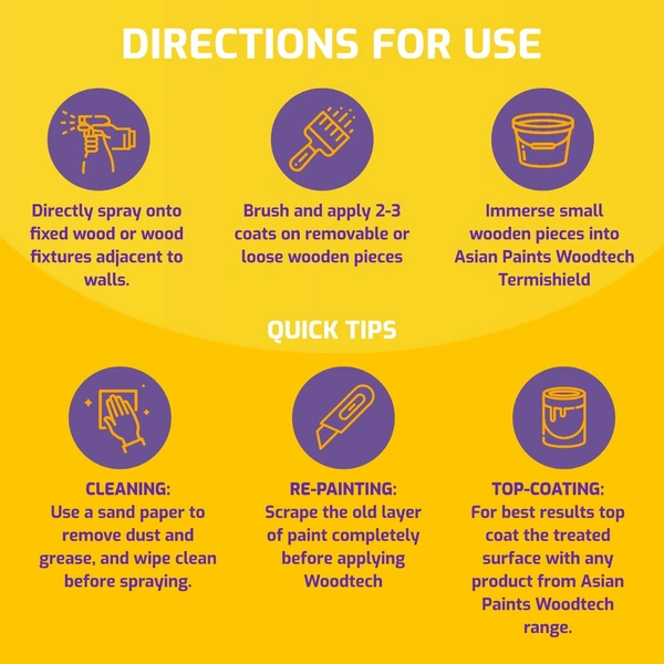 - PROTECTION AGAINST TERMITES: Asian Paints Woodtech Termishield Spray offers the best protection against termites and borers