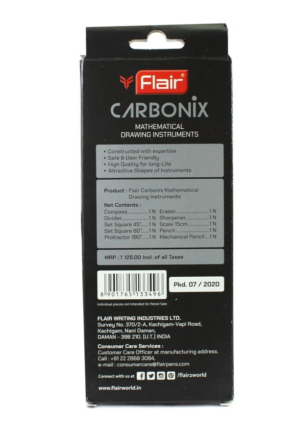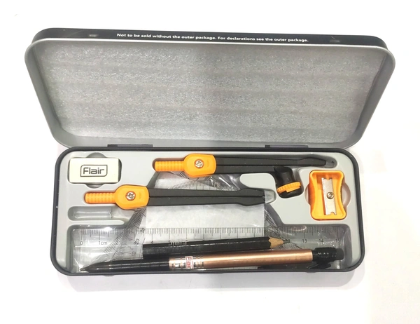 Mechanical Pencil 0.7mm, Lead Box with 10 leads, Compass Holder, Divider Holder, Set Square, Scale 15cm, Protractor, Pencil, Eraser, Sharpener.